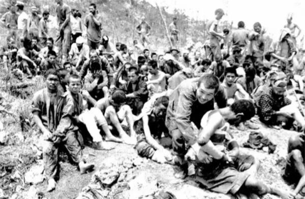 ▲日本投降后,冲绳岛上的难民。冲绳战役期间,大量冲绳本地居民被日军裹挟,编入战争体系,该役非正常死亡的冲绳人中,除了死于炮火和疾病、饥饿,还有很多居民死于日军强制“集体自决”。