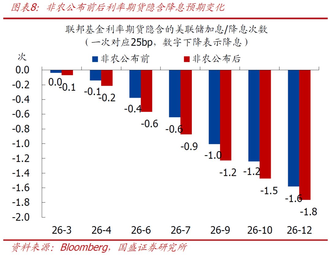 >降息预期变化:非农公布后,市场对美联储降息的预期小幅升温。利率期货隐含的6月降息概率从37.8%上升至56.7%,首次降息时点预期仍在9月(1次→1.2次),2026全年降息次数由1.58次上升至1.76次。