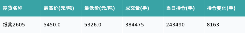 21智讯1月16日电,南财金融终端盘后期货数据显示V交易网,上海期货交易所的纸浆主力合约收跌1.94%V交易网,收盘报5362.0元/吨V交易网,日内资金流入3689.81万元。其他相关指标见下表: